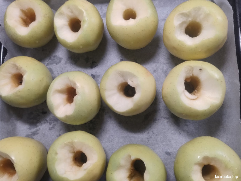 - Leikkaa vihreistä omenoista ytimet pois ja aseta ne uunipellille.