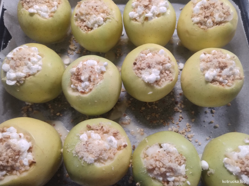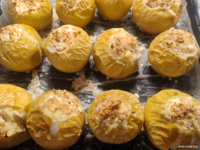 Uunissa haudutut omenat, täytettyinä rahkalla, pähkinöillä, hedelmillä ja hunajalla.