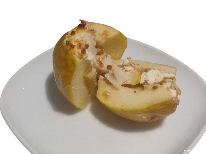 Uunissa haudutut omenat, täytettyinä rahkalla, pähkinöillä, hedelmillä ja hunajalla.