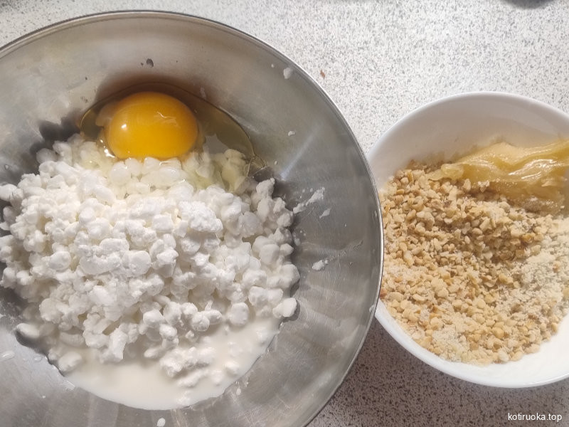 Täytteenä käytetään tuorejuustoa, munaa, pähkinöitä, hedelmiä (minä käytin päärynää), hieman voita ja hunajaa.